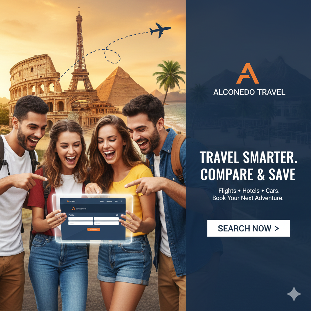Alconedo Travel is your independent online platform for finding deals. We are a powerful comparison engine, partnering with top travel brands to bring you exclusive offers on flights, hotels, and car rentals. We cut through the noise so you can travel smarter, not harder.